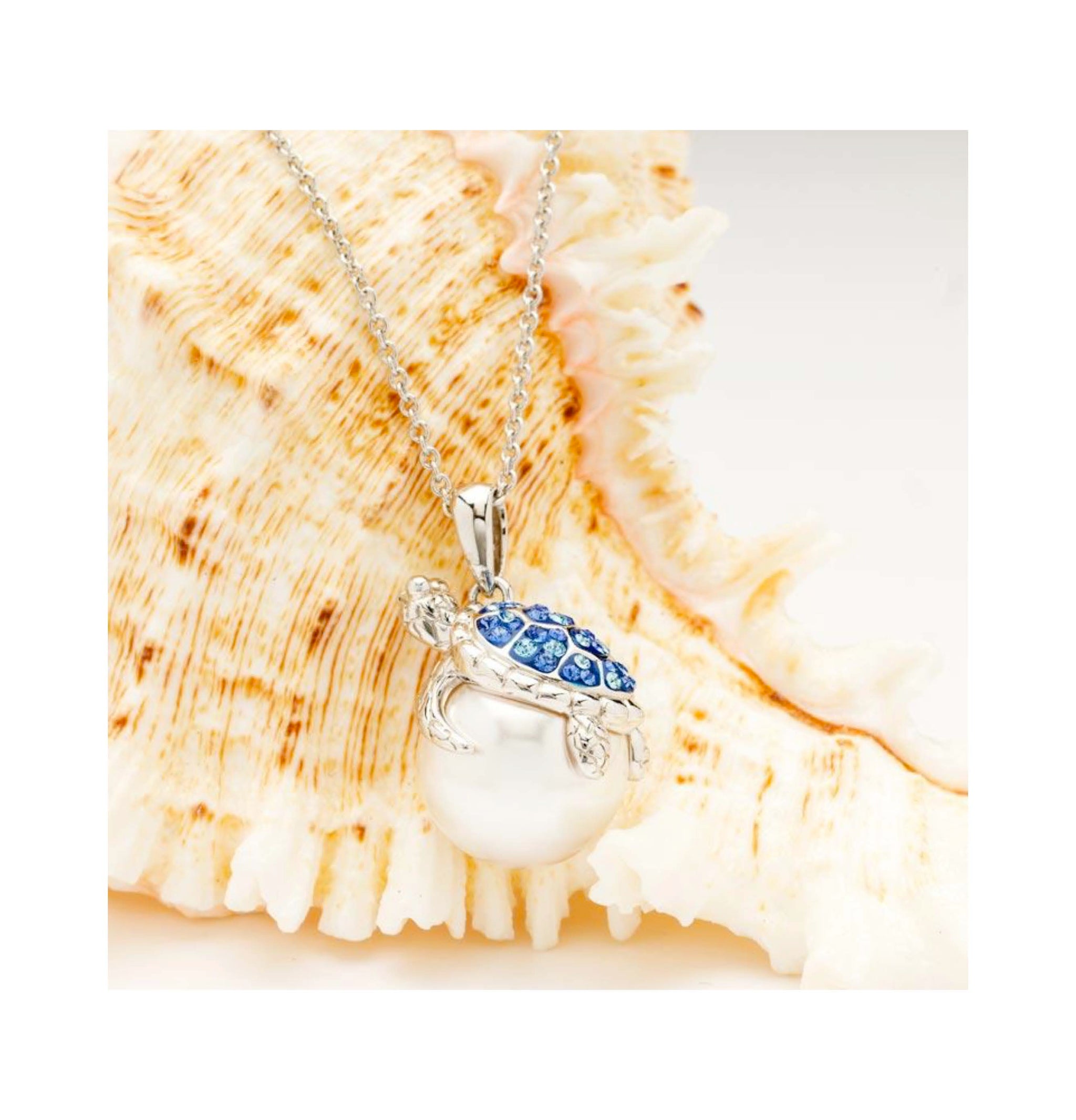 Sterling Silver Sea Turtle Necklace with Pearl and Sapphire Crystals
