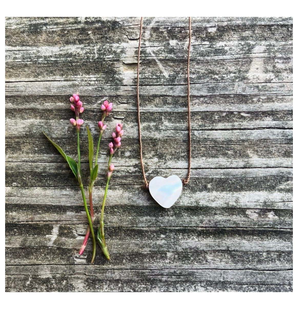 White mother of pearl heart, hand knotted light brown cord - heat set delicate nylon thread with strong durability and resistance to fraying. Sterling silver...