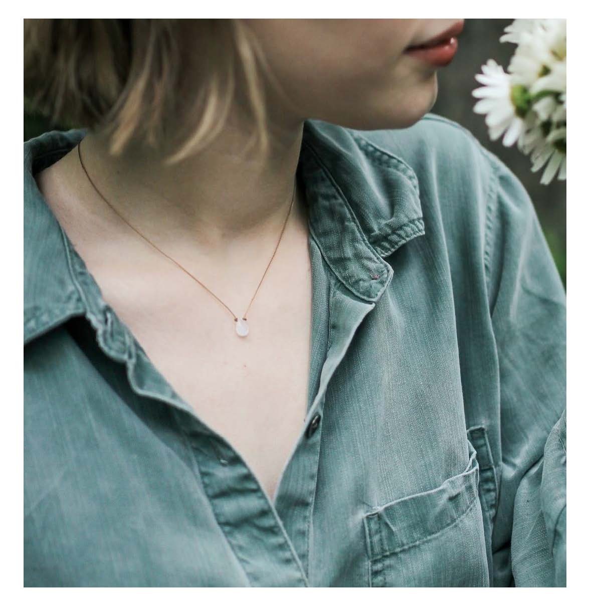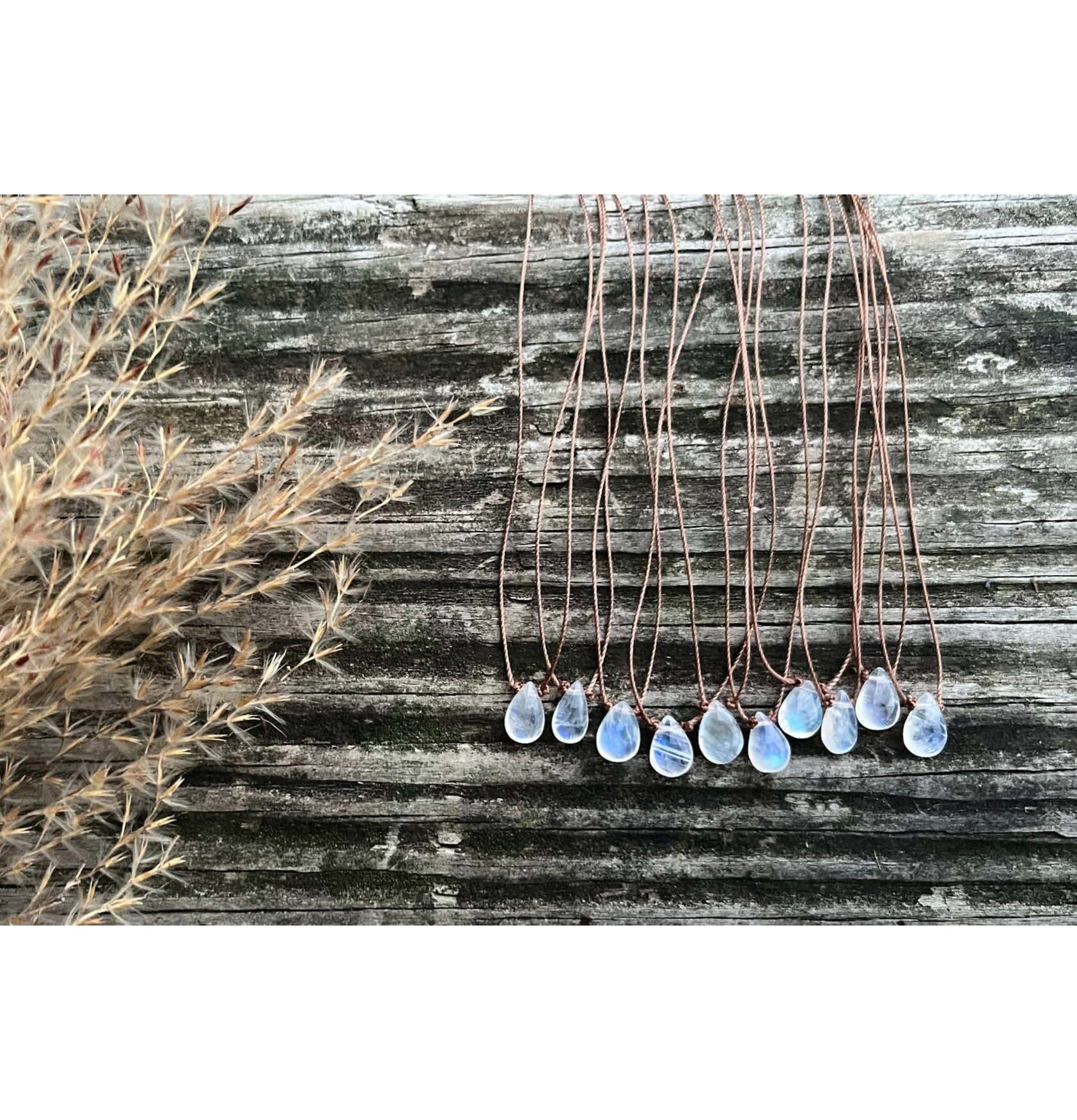 Smooth rainbow moonstone teardrop pendant on light brown cord - heat set delicate nylon thread with strong durability and resistance to frayingSterling silver clasp18"Natural materials...